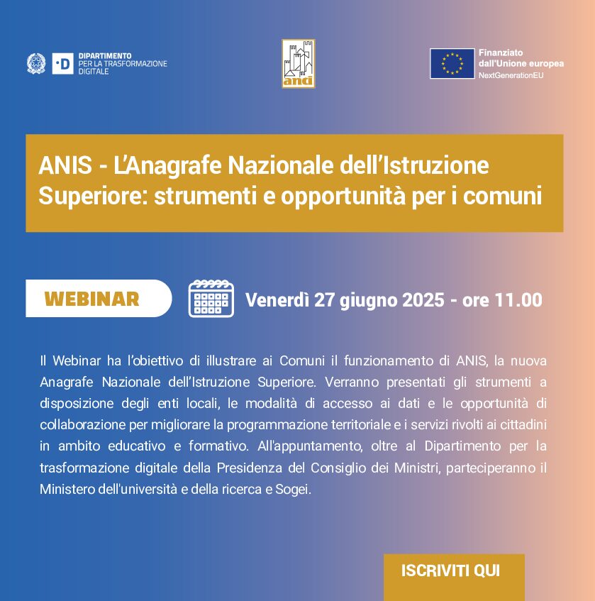 27 giugno 2025 Ore 11:00 Webinar “ANIS – L’Anagrafe Nazionale dell’Istruzione Superiore: strumenti e opportunità per i comuni”
